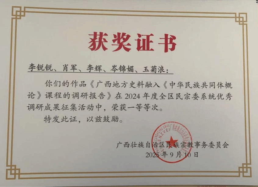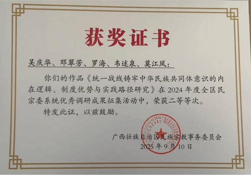 该优秀调研成果征集活动经广西大学、广西民族大学、广西社会主义学院、广西民族研究中心等单位的5位专家对全区参评的171篇调研报告进行匿名评审,评选出2024年度全区民宗系统优秀调研报告共36篇。其中,一等等次8篇,二等等次12篇,三等等次16篇。本次成果征集中我院获奖成果中,一等等次成果《广西地方史料融入<中华民族共同体概论>课程的调研报告》基于对广西地方史料融入中华民族共同体概论课程教学的调研,在中华民族共同体概论课程教学中,结合广西地方史料的历史脉络、内容属性与学生专业特点,建立了“章节—理论—史料”三维联动模式,实现了广西地方史料与概论课程知识点的有效链接。二等等次成果《统一战线铸牢中华民族共同体意识的内在逻辑、制度优势与实践路径研究》集中探讨了统一战线工作促进铸牢中华民族共同体意识工作的理论逻辑、制度优势和工作方法。