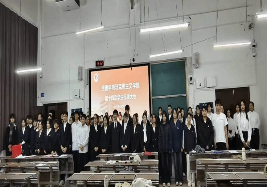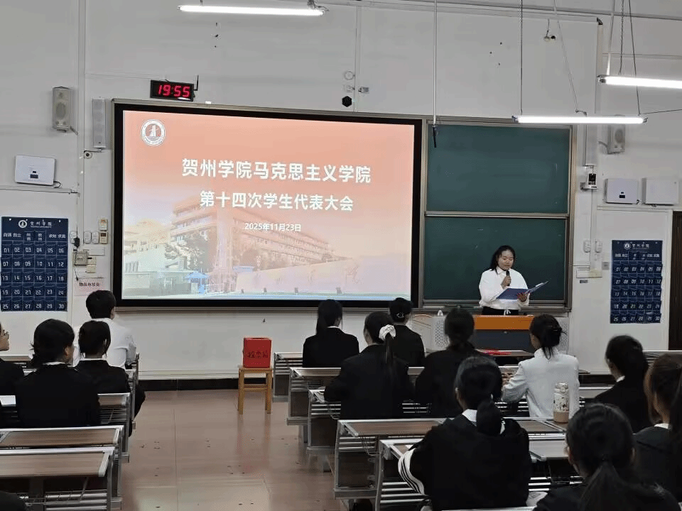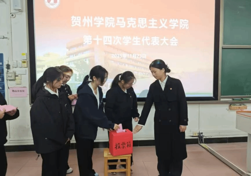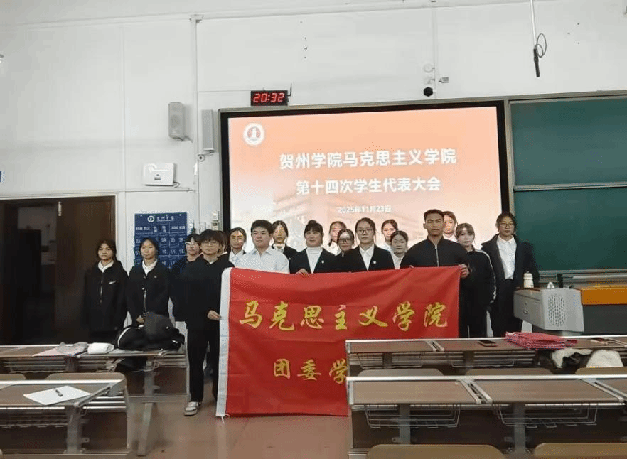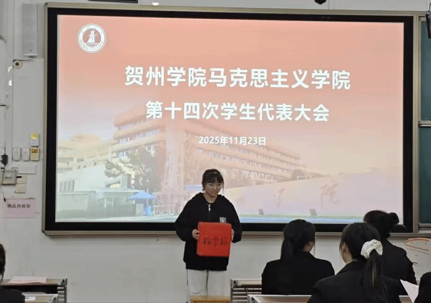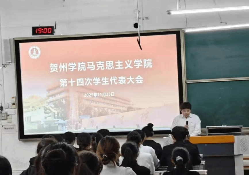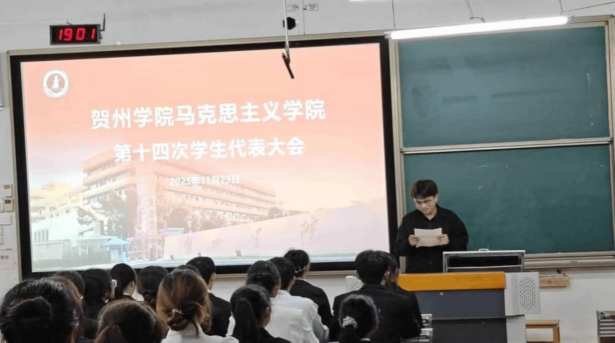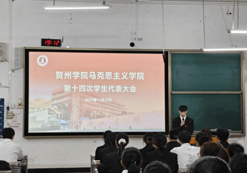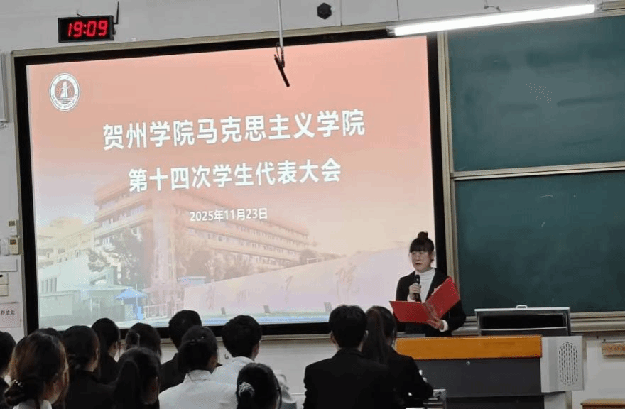 2025年11月23日晚,贺州学院马克思主义学院第十四次学生代表大会于乐教楼A109教室顺利召开。学院团委书记韩耀老师、校学生会执行主席赵立,校学生会外联部负责人张勇,人工智能学院学生会执行主席王天魁,材料与化学工程学院学生会执行主席陈文娣,旅游与体育健康学院学生会执行主席张雪等嘉宾与会,与全体代表共商我院学生工作发展大计。
