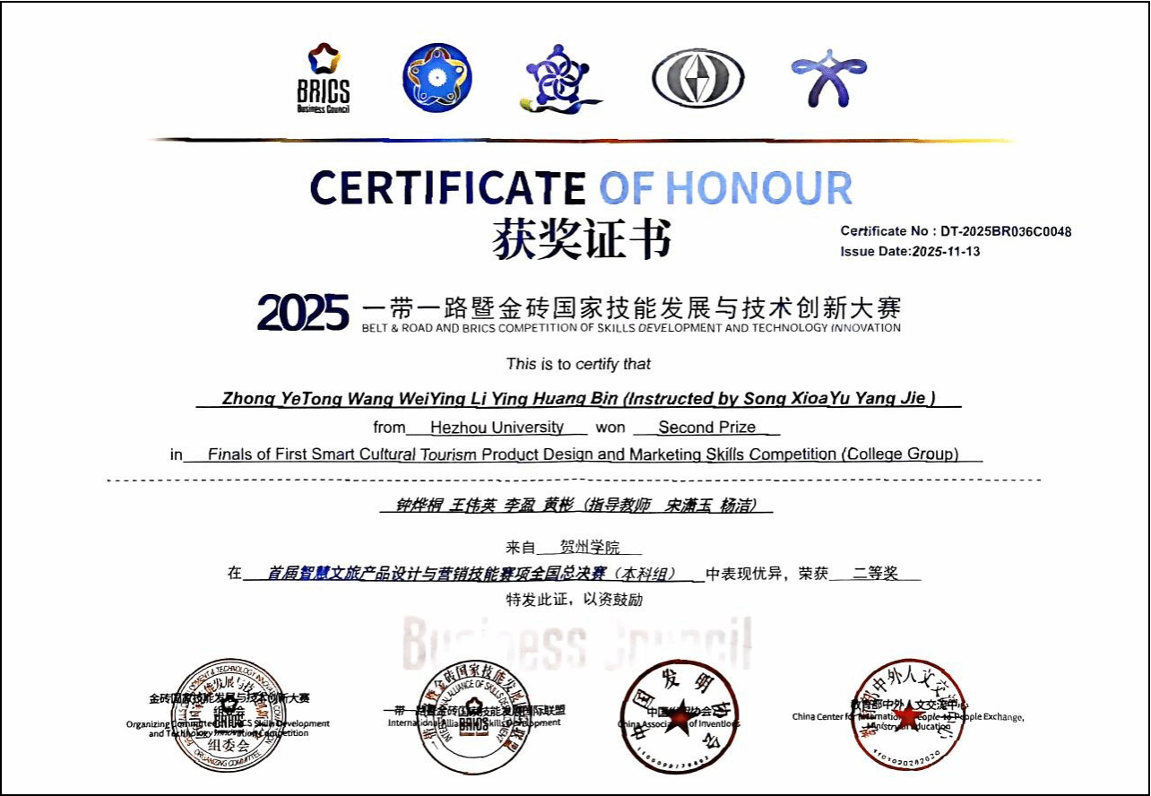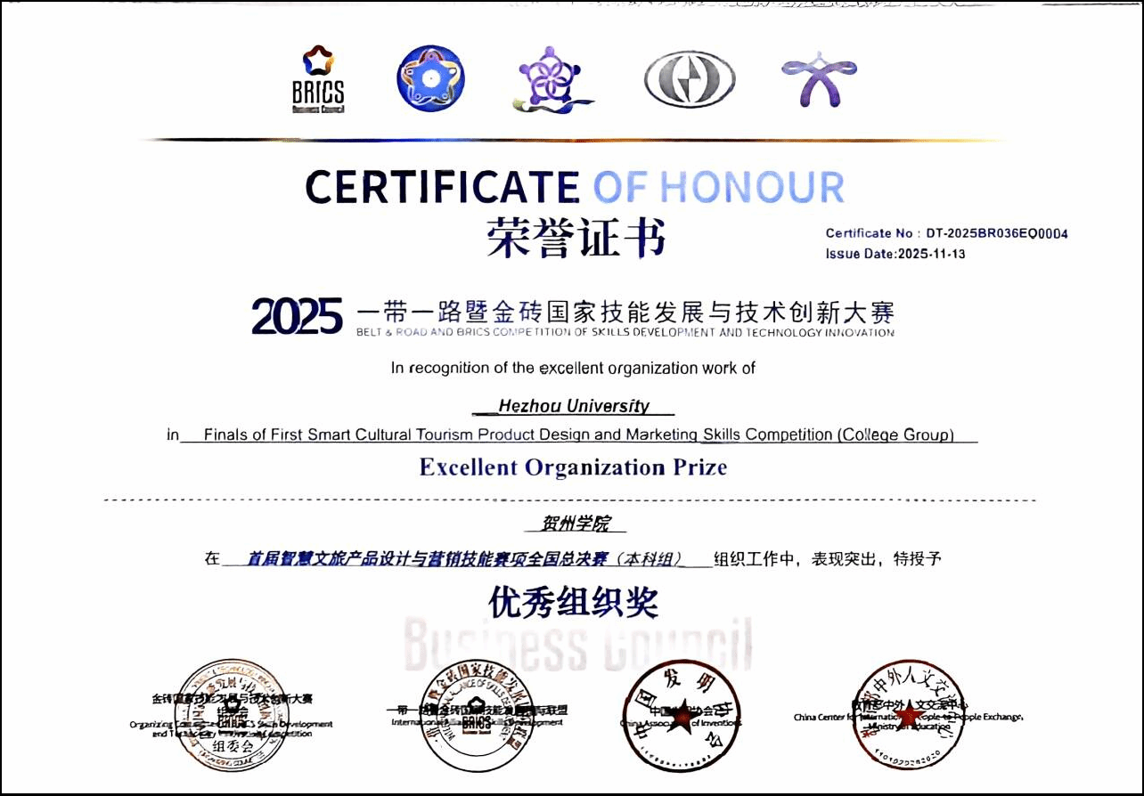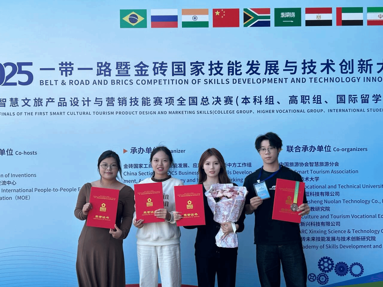 2025年11月13日,2025“一带一路”暨金砖国家技能发展与技术创新大赛首届智慧文旅产品设计与营销技能全国总决赛在南宁职业技术大学圆满落幕。该项大赛是2017年金砖国家最高领导人会晤筹备委员会认可、经中华人民共和国外交部备案、金砖国家工商理事会批准的国际大赛,已连续多年被纳入中国高等教育学会《全国普通高校大学生竞赛分析报告》竞赛目录,是推动金砖国家间教育合作、技能开发与人文交流的重要平台。