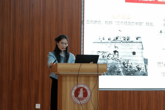 韦坤伶老师聚焦“伟大抗战精神的丰富内涵”授课模块,通过先辈光辉事迹与影音视频相结合的方式深入解读“天下兴亡、匹夫有责的爱国情怀,视死如归、宁死不屈的民族气节,不畏强暴、血战到底的英雄气概,百折不挠、坚韧不拔的必胜信念”四大核心精神内涵,帮助师生建立对抗战精神内涵的深刻认知。李锐锐博士在主讲“伟大抗战精神的时代特征”中,从多维度阐释伟大抗战精神的时代特征,指出其既是民族复兴的精神纽带,也是创新发展的思想引领,更是全球治理的价值遵循。