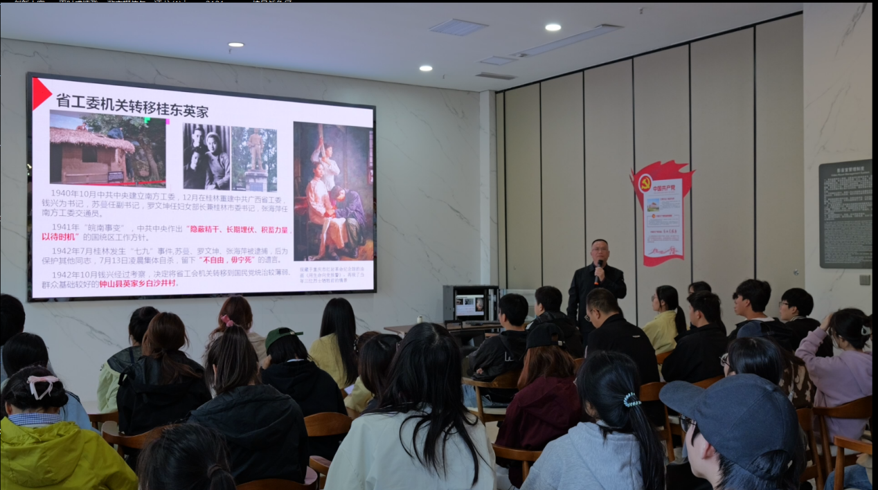 本专题教学创新采用“理论讲授 + 现场教学”相结合的形式,构建起“理论讲解—实地体悟—精神传承”的完整育人模式。在现场教学中,朱其现教授以“抗战中的广西”为切入点,通过何香凝敌后宣传、欧阳予倩文化救国等典型案例,层层递进解读“烽火里的黄姚”红色历史,深刻阐释“天下兴亡、匹夫有责”的抗战精神内核,为师生上了一堂兼具理论厚度与情感温度的生动党史理论课。