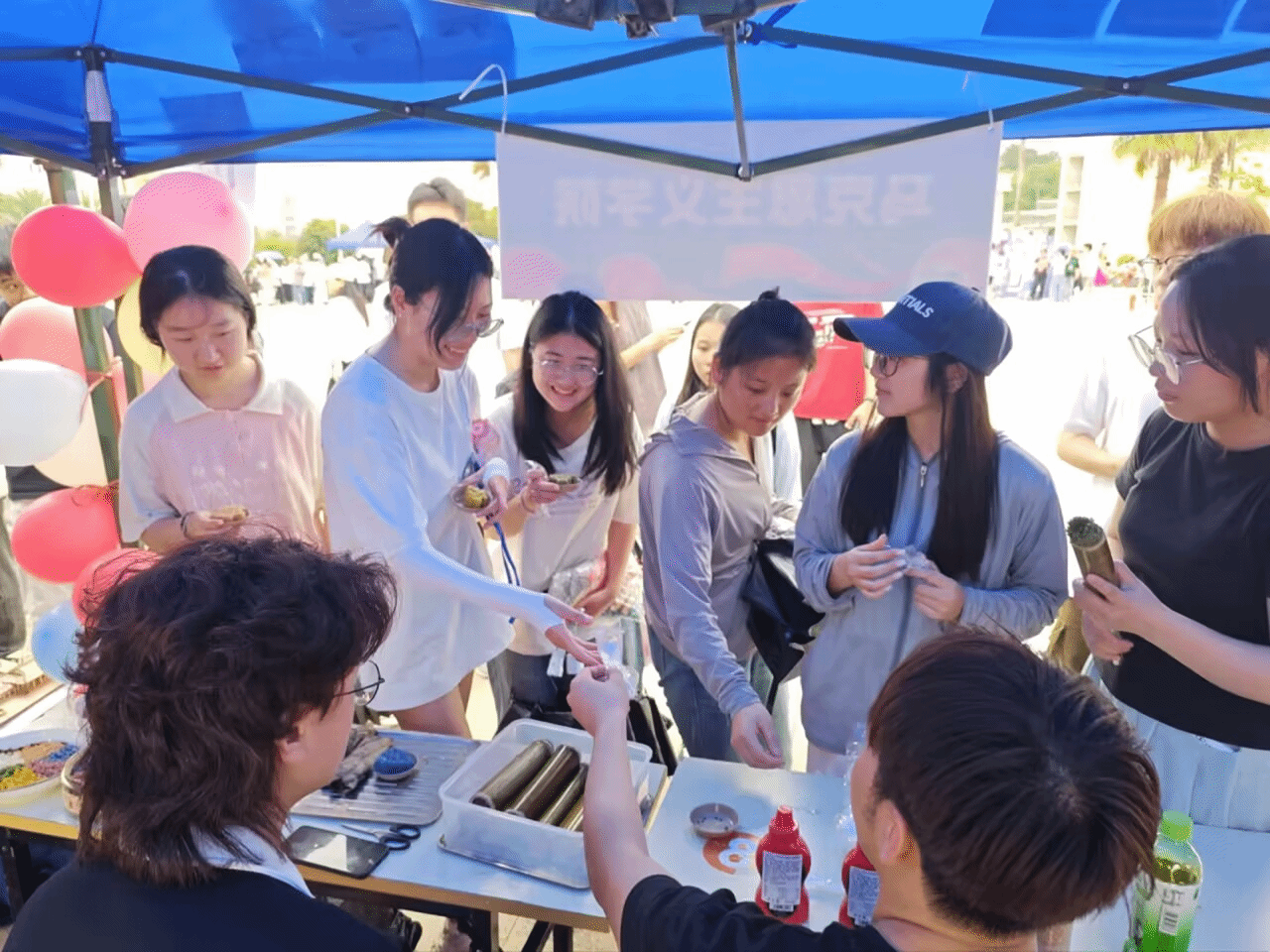 活动现场暖意融融、糯香四溢,学院主题展位成为艺术广场上极具民族特色的亮眼风景线。展位上,色泽饱满艳丽、香气浓郁纯粹的五色糯米饭整齐陈列,搭配广西三月三民俗文化、五色糯米饭历史渊源的主题展板,吸引了往来师生纷纷驻足打卡、参与体验。