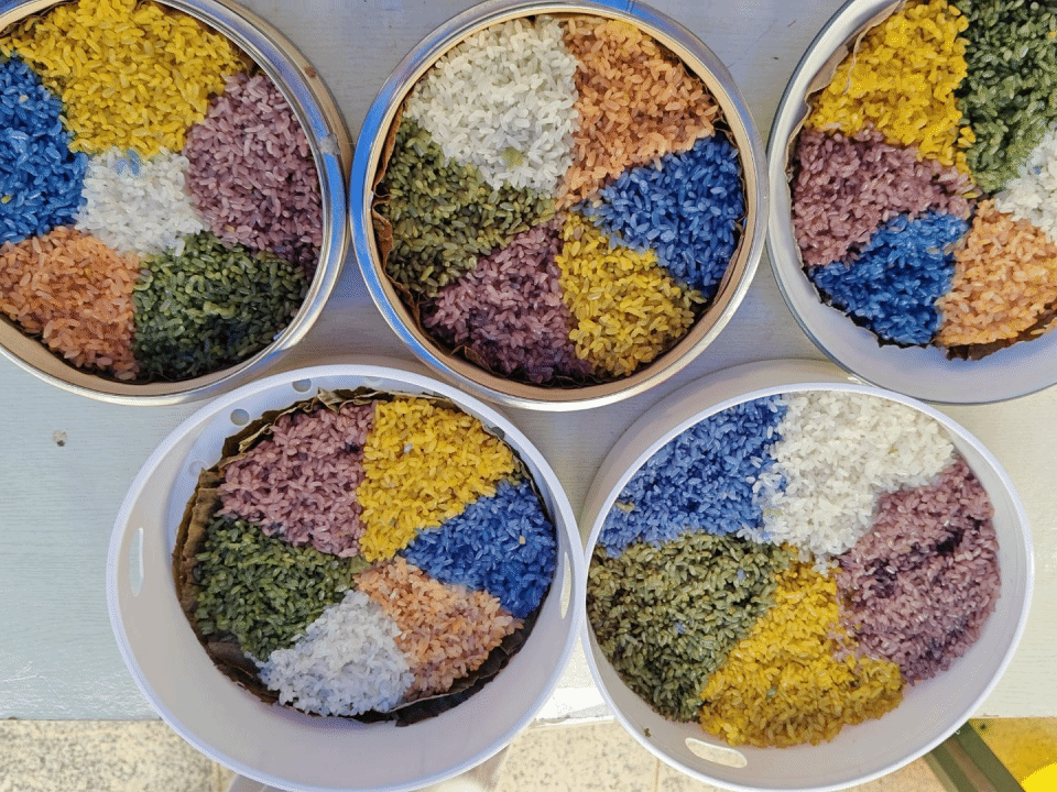 为办好本次活动,学院提前周密筹备、精心打磨,严格遵循壮族传统古法工艺,组织师生完成了五色糯米饭的全流程制作。从天然植物染料的筛选萃取、糯米的分色浸泡,到传统甑具的恒温蒸煮,每一道工序都精益求精,完整还原了壮族五色糯米饭的地道风味与制作匠心,为嘉年华现场活动的顺利开展筑牢了基础。