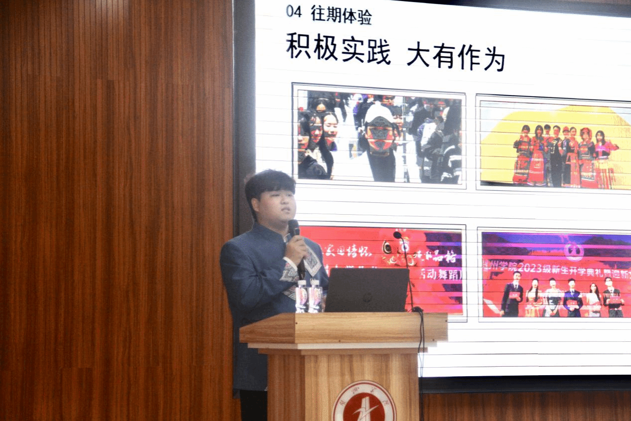 接着,由“壮美广西”课程的往届学生2021级学生许大龙和2022级学生王钰分享课程感悟。许大龙同学以“积极实践,大有作为”为主题,分享了他在“壮美广西”课程中的成长历程,从课程特色和个人成长方面分享了他对这门课程的理解和感悟,并鼓励同学们积极为班级、学校和社会做贡献,做有理想有担当的时代新人。