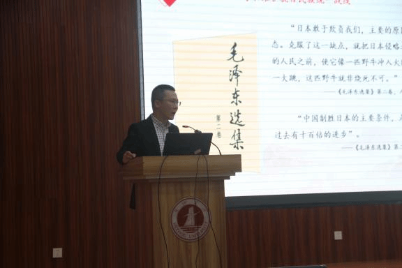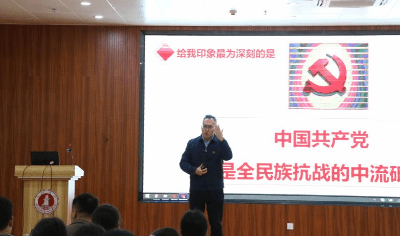 授课团队遵循“成立—担当—原因—启示—意义”的历史逻辑,分篇章层层递进展开教学,凸显“中国共产党是全民族抗战的中流砥柱”核心主旨。课程序章“百年变局·砥柱启航”中,党委副书记毛芳才以“中国人民14年浴血奋战中最感动的历史事件”为引,结合平型关大捷、南泥湾大生产等经典史实,搭配系列抗战歌曲沉浸式呈现,直观引出课程核心论点,为整场教学奠定历史基调。